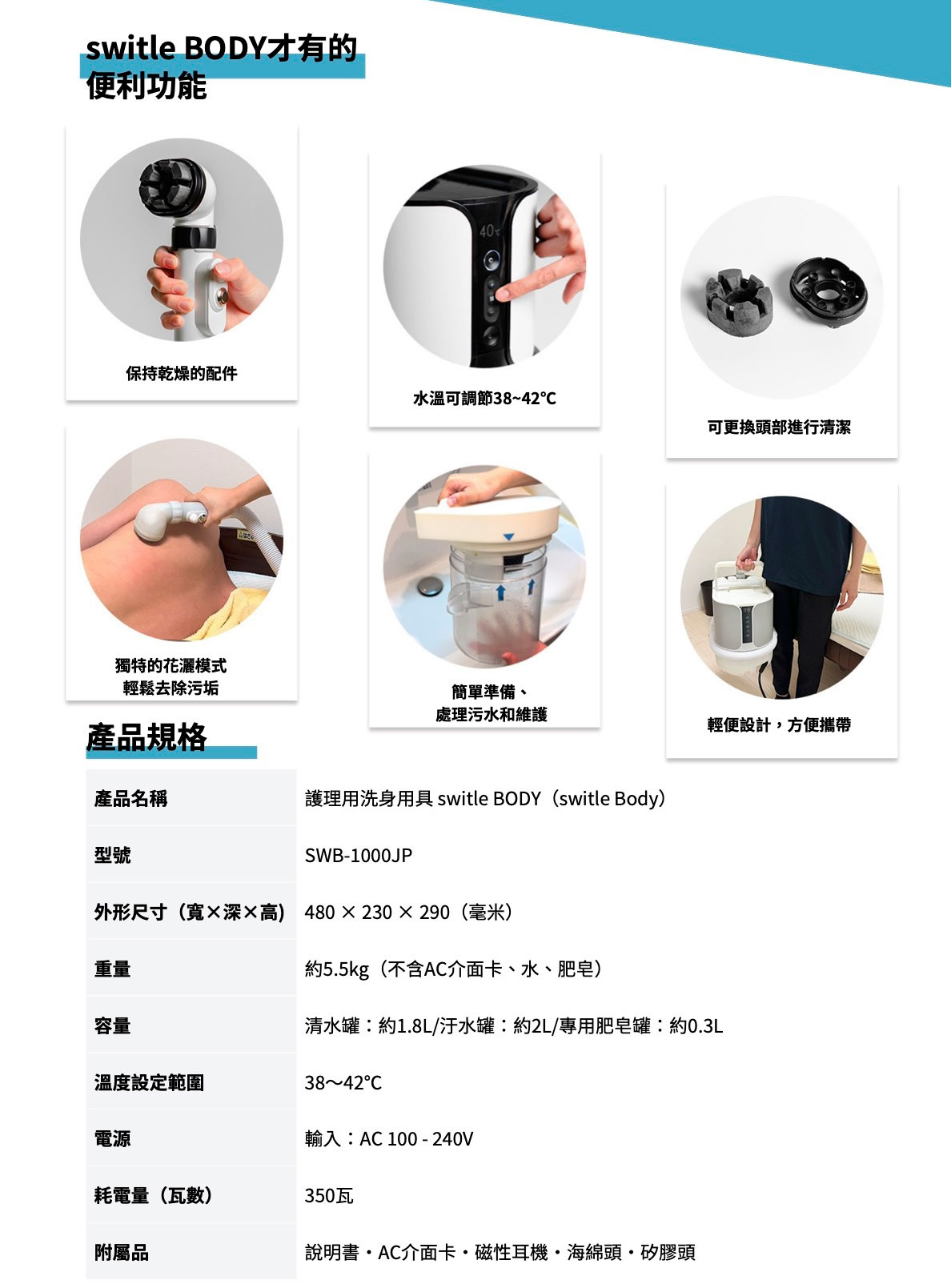 switleの水を噴射しながら吸い取る機構、ヘッドに独自の湿式吸引アタッチメントを採用することにより、液だれすることのない洗身を実現しました。