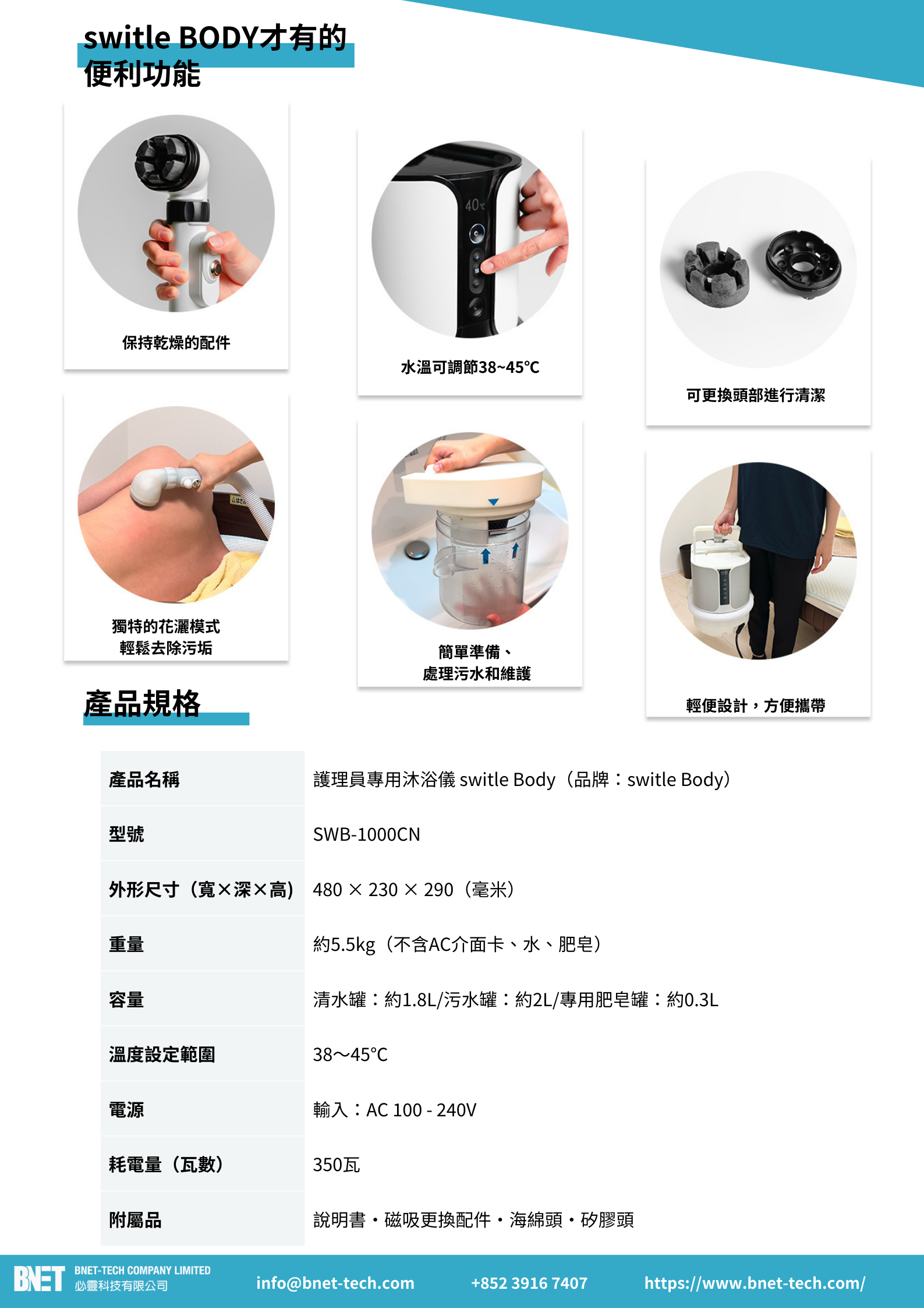 僅需約1公升的水即可完成預洗、洗身和沖洗。此外,系統採用在必要時才加熱水的設計,有助於節水節電,減輕經濟負擔。
